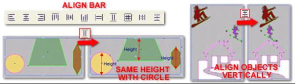 Object Alignment abilities are available from within the Create tab which allow you to make accurate adjustments to your design. You can also set objects to have equal distances between them by distributing them automatically on the working area. Additionally, you can make sides of objects or entire objects to have the same size with only a single click of the mouse.