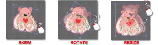 By using the mouse inside the Create tab of DRAWings 4 you can easily Resize, Skew, Rotate and Mirror any object or even entire designs, without having to switch between tabs.