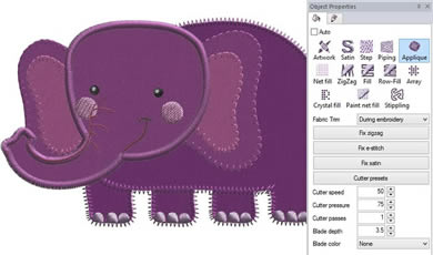 You can now set the holding stitches to E-stitch or Zig-Zag and select the way the fabric will be trimmed from the Fabric trim option. A new feature to remove overlapped Applique is added. The Fabric trim option that you will select, will affect the way the applique design will be embroidered. The applique fabric can also be cut with your Cutter.