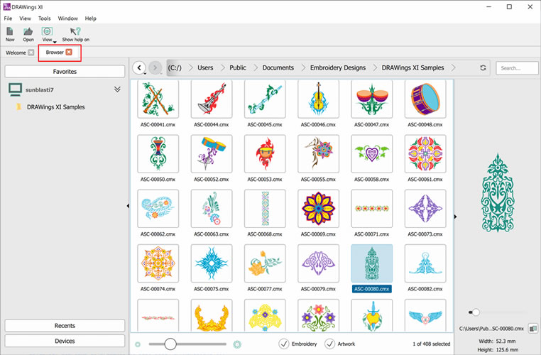 The new File browser is improved and enhanced with a lot of new features. You can now filter designs by artwork (graphics designs) or by embroidery, preview the designs along with full file browser abilities such as create new folder, cut - copy - paste - move designs, and many more. |