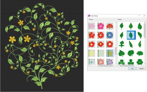 This is a new revolutionary feature which dynamically creates floral designs and fill areas to apply to your designs. You may combine this feature with your own designs and even set your own flower designs to be used by the floral creation. The combinations are unlimited.