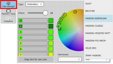 The color management system changed completely. Now it is easier to manage colors and select the thread palette you prefer. It includes a color wheel where all the colors are positioned and you can easily change them by simply dragging the color to a new position. |
