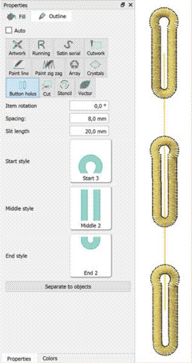 Button holes are now possible with many variations. You can adjust the three parts that the button holes consist off separately and produce many different button hole variations. They can be applied on a drawn line and you can adjust their size and the distance between them. |