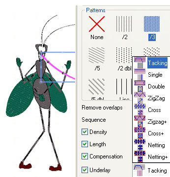 Unlike the other automated software, while auto digitizing is performed, DRAWings® XI Pro still allows you to have full control on both vector artwork editing and embroidery stitch editing, you can unlimited reshape or resize your graphic, the stitches will be updated instantly using automatic underlay, density, sequence and color match based on the chosen fabric and thread manufacturer, you can also alter stitch types and settings on each individual stitch object after it is digitized by the software. |
