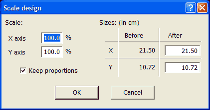 On the left hand side of the dialogue ("X" axis and "Y" axis) you can scale the design as a percentage of the current size. When changing the percentage on the scale, the "X" and "Y" fields (on the right side) are also being changed. If the change is more than 100%, the design will be enlarged, if less than 100%, it will be shrunk.