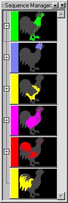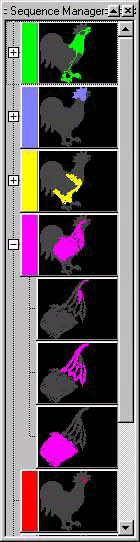 The Sequence Viewer shows the objects in two levels. On the first level you can see the parts of the current design separated by the special functions, like color change, thread trims etc. (Figure 1). On the second level you can see the objects of every part of the first level. This can be done by clicking on the "+" which is on the left side of the sequence manager icon. If there is no "+" sign, then it means that this part is an object and it cannot be split (Figure 2). If you want to go from the second level back to the first one, you have to click on the "-" sign on the left side of the sequence manager icon. With the scroll bar of the right side of the Sequence Viewer (Figure 2), you can see (whether is necessary) the objects that are hidden.